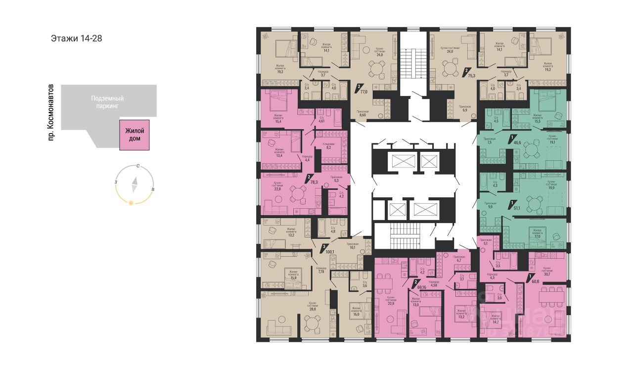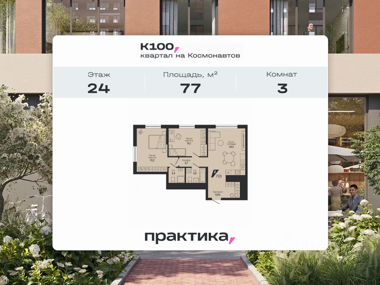 Жилой квартал "К100" на Космонавтов, 100 будет состоять из трех монолитно-кирпичных домов, объединенных общим двором. Застройщик компания "Практика". Планировки начинаются от 44,8 м² и доходят до 159,5 м². На каждом этаже располагается от восьми квартир классического и евроформата от двух до пяти комнат. Застройщик предлагает два вида отделки: white box и чистовую. Есть возможность перепланировки. Двор с ландшафтным озеленением разделен на три зоны. Для детей игровые площадки с меловыми досками и уличными шахматами, для взрослых лаунж-зона с креслами и столиками для отдыха, для спортсменов воркаут-площадка. На первом этаже лобби-клуб с игровыми комнатами, залом для йоги, коворкингом и мини-кинотеатром, колясочные и велосипедные помещения. Для автомобилистов предусмотрены гостевые места и подземный паркинг с доступом на лифте. На всей территории жилого комплекса установят видеонаблюдение. В доме будет работать консьерж-сервис в режиме 24/7. Дополнительные услуги включают клининг, выгул домашних животных, доставку еды из ресторанов и вызов такси. Также предусмотрена система "Умный дом". Рядом с жилым комплексом находятся сосновый бор, школы, детские сады, медицинские учреждения, торговые центры и супермаркеты, остановки общественного транспорта и станция метро. В шаговой доступности от дома откроется новый корпус уникальной гимназии "Арт-Этюд" — многопрофильного центра общего и художественного образования для детей от 3 до 18 лет. Строительство первой очереди жилого квартала "К100" на Космонавтов, 100 завершится в четвертом квартале 2026 года.