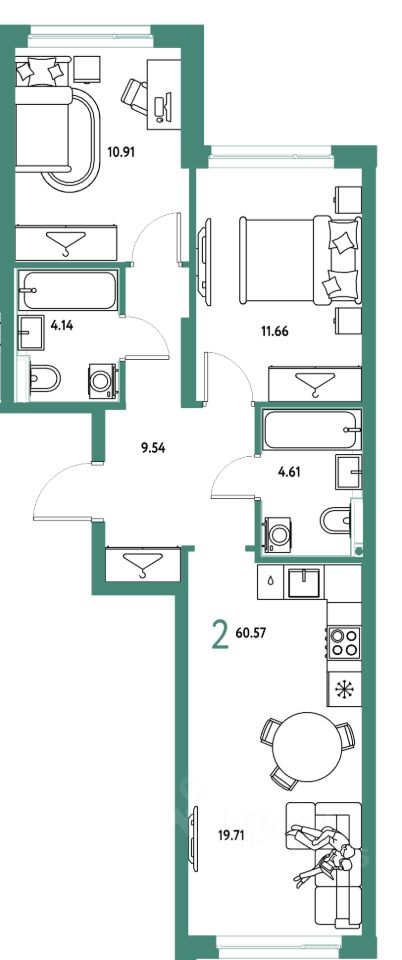 Продаётся 2-комнатная квартира в строящемся доме (Потенциал), срок сдачи: IV-кв. 2027, общей площадью 60.57 кв.м., на 14 этаже. Новый жилой комплекс "Страна.Энтузиастов" от группы компаний "Страна Девелопмент" расположен по адресу: г. Екатеринбург, по ул. Шефская.