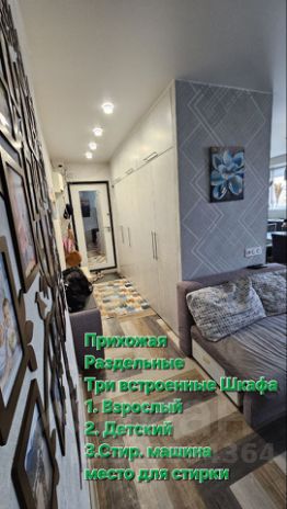 Прихожая со встроенный шкафом, разделённым на три секции, в одной стиральная машина и всё для стирки.