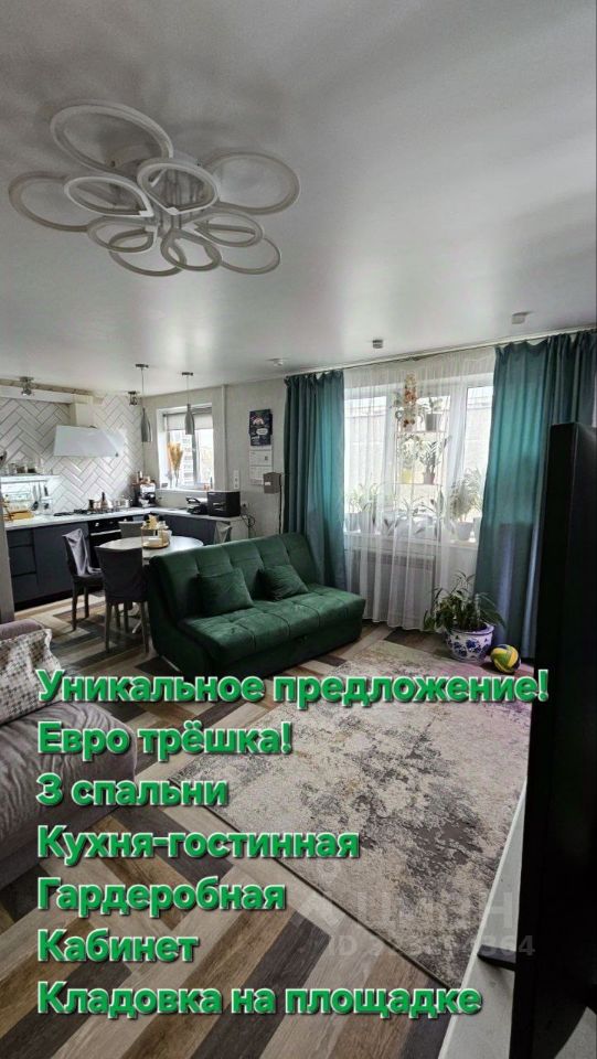Евро трёшка, с раздельными тремя спальнями, кухня-гостинная, гардеродная, кладовка на этаже. По цене обычной трёх комнатной. Качественный ремонт.