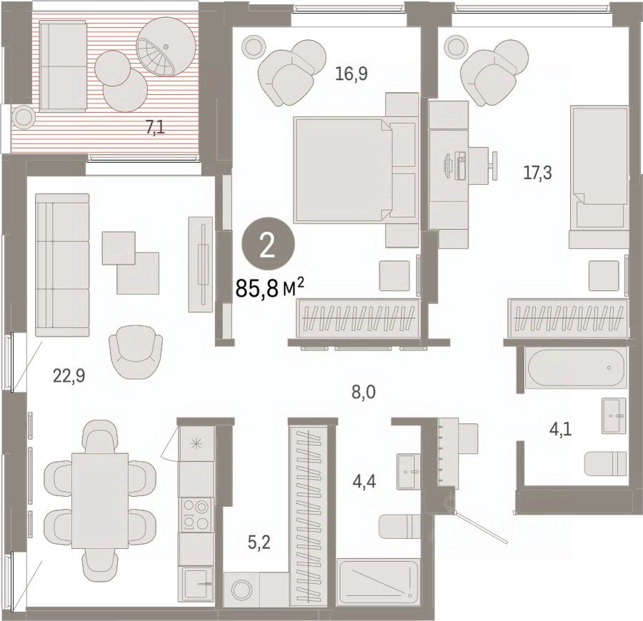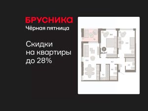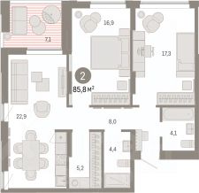 Квартира с кухней-гостиной и двумя спальнями в районе Шишимская горка. Особенности планировки: второй санузел, гардеробная, лоджия, предчистовая отделка.