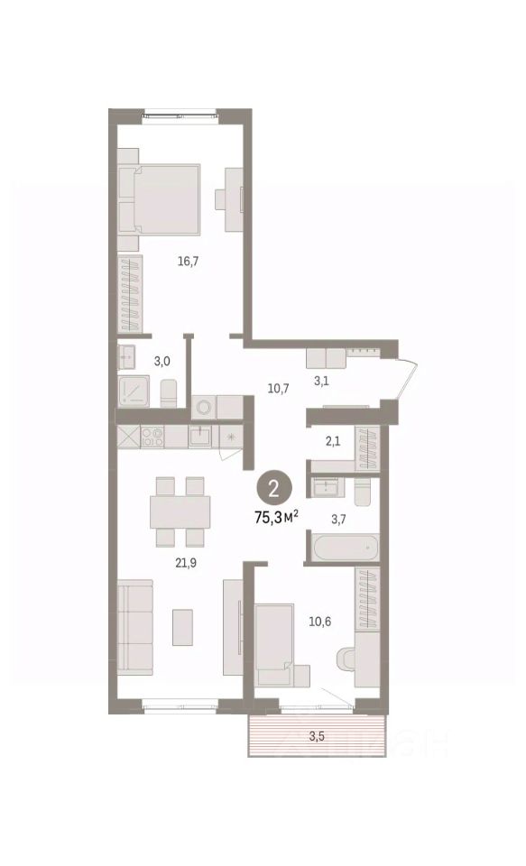 Квартира с кухней-гостиной и двумя спальнями в Южных кварталах. Особенности планировки: окна на две стороны, гардеробная, вид во двор, разнесённые спальни, предчистовая отделка, мастер-спальня, балкон.