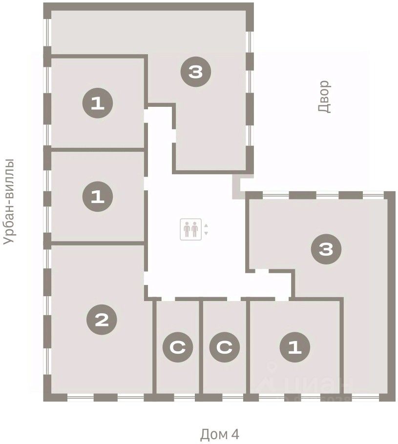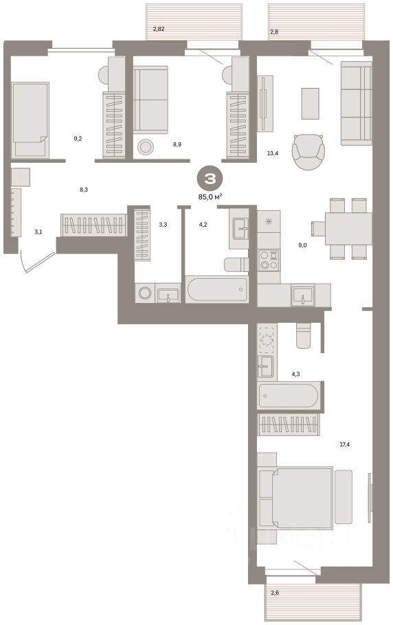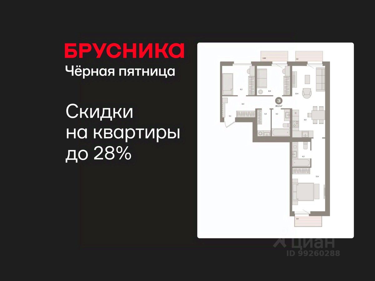 Квартира с кухней-гостиной и тремя спальнями в Южных кварталах. Особенности планировки: окна на две стороны, вид во двор, разнесённые спальни, предчистовая отделка, мастер-спальня, постирочная, балкон.