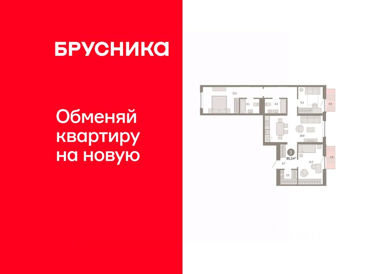 Квартира с кухней-гостиной и тремя спальнями в Южных кварталах. Особенности планировки: балкон, окна на две стороны, предчистовая отделка, разнесённые спальни.