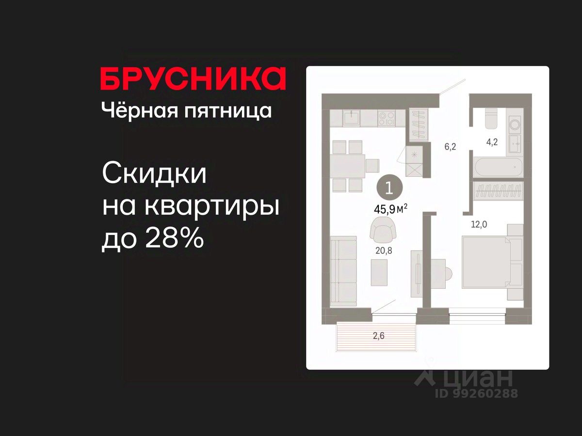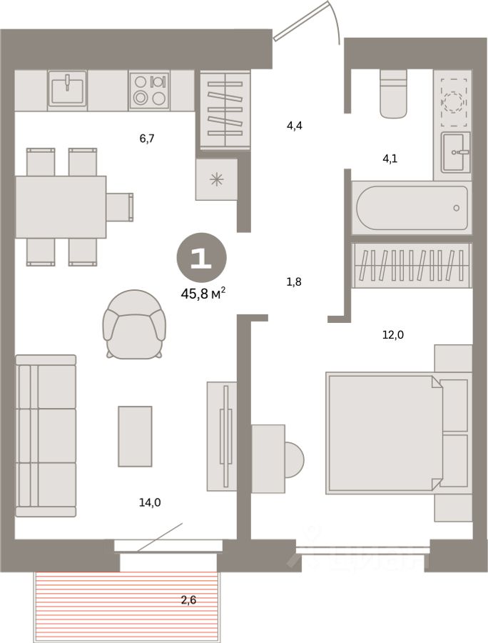 Квартира с кухней-гостиной и одной спальней в Южных кварталах. Особенности планировки: предчистовая отделка, балкон.