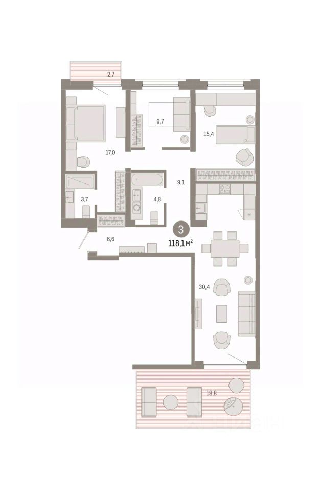 Квартира с кухней-гостиной и тремя спальнями в Южных кварталах. Особенности планировки: окна на две стороны, рабочий кабинет, вид во двор, разнесённые спальни, предчистовая отделка, мастер-спальня, терраса, балкон.