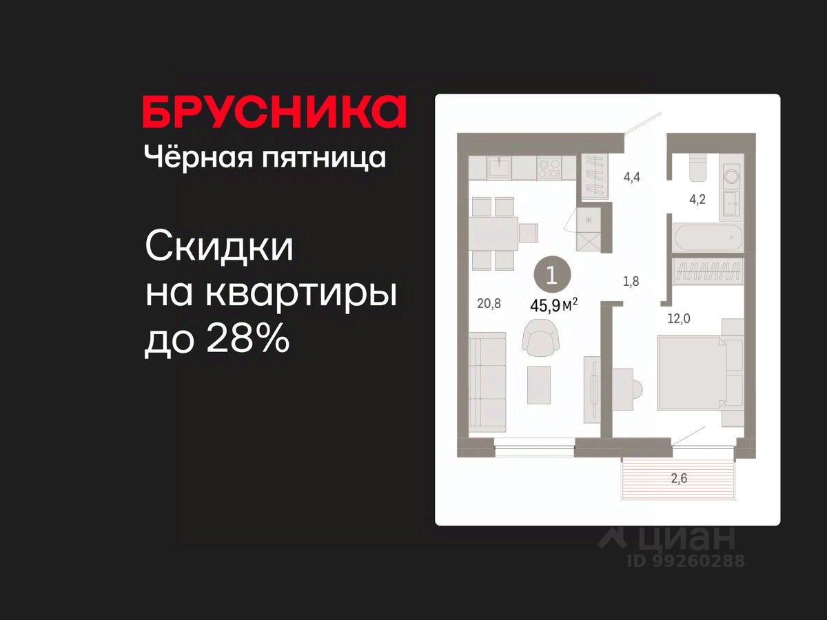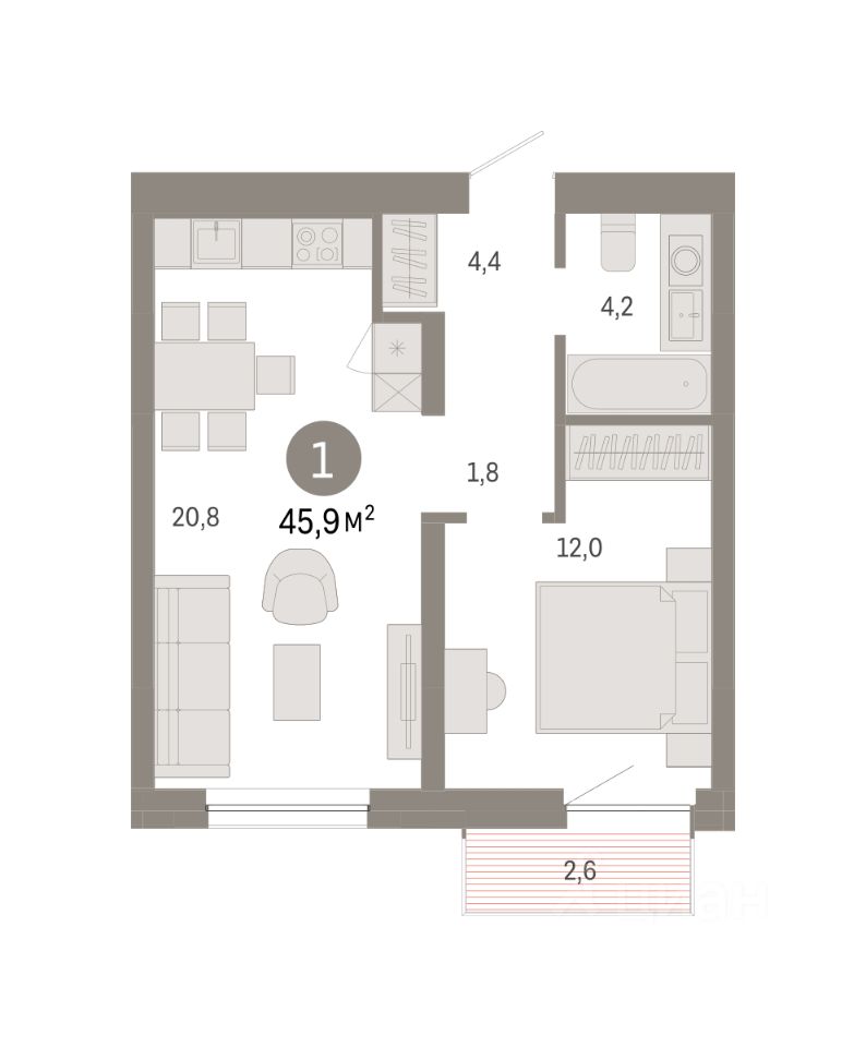 Квартира с кухней-гостиной и одной спальней в Южных кварталах. Особенности планировки: предчистовая отделка, балкон.