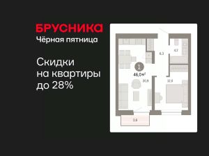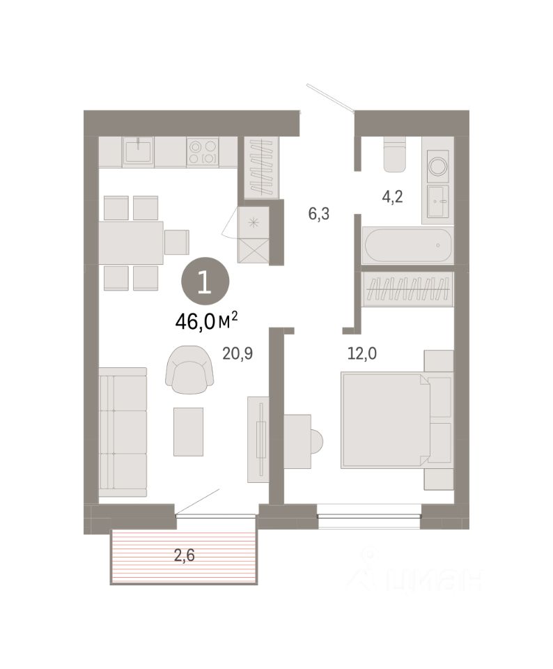 Квартира с кухней-гостиной и одной спальней в Южных кварталах. Особенности планировки: предчистовая отделка, балкон.