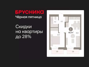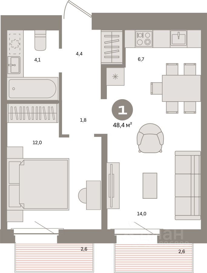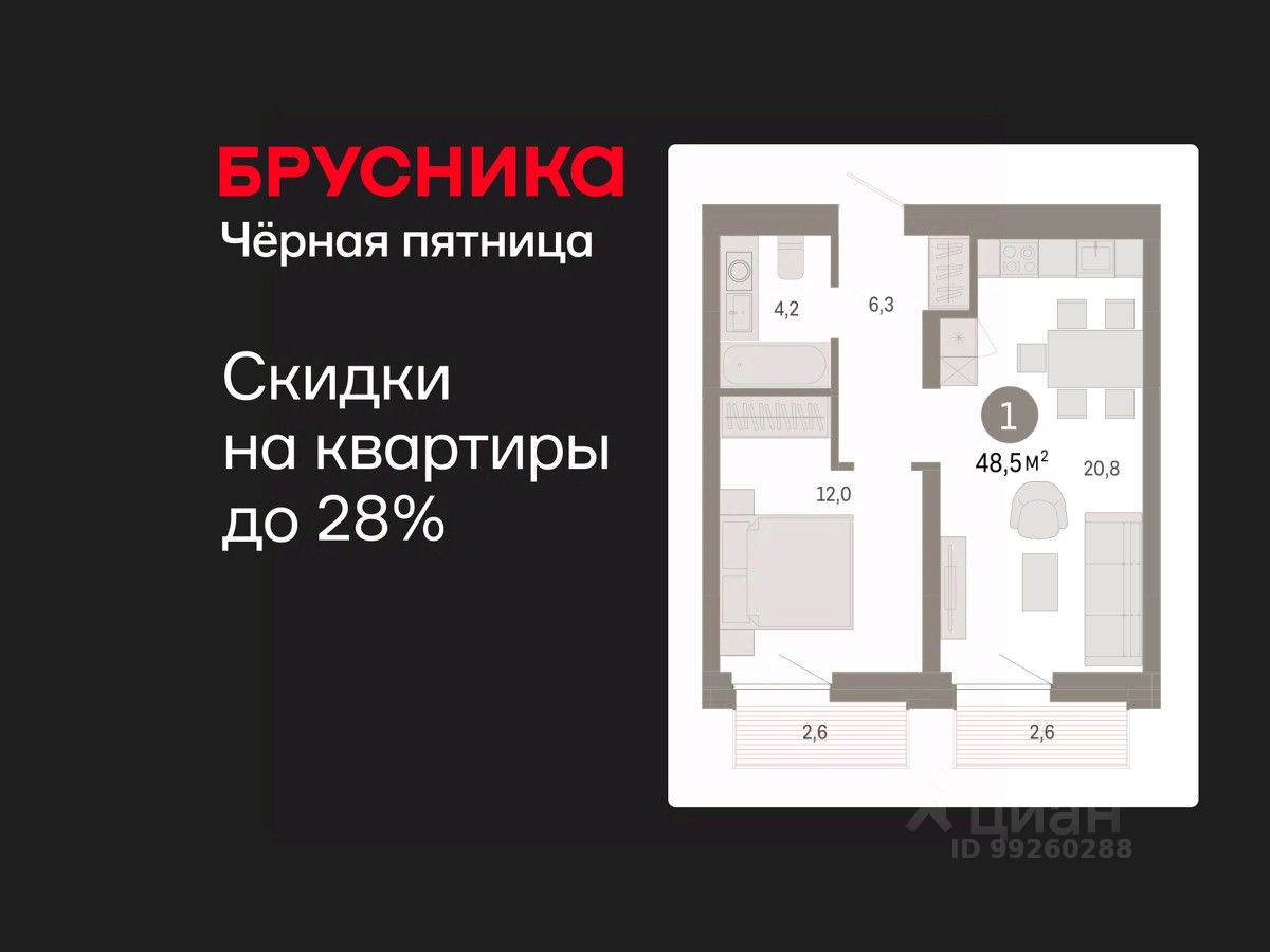 Квартира с кухней-гостиной и одной спальней в Южных кварталах. Особенности планировки: предчистовая отделка, балкон.