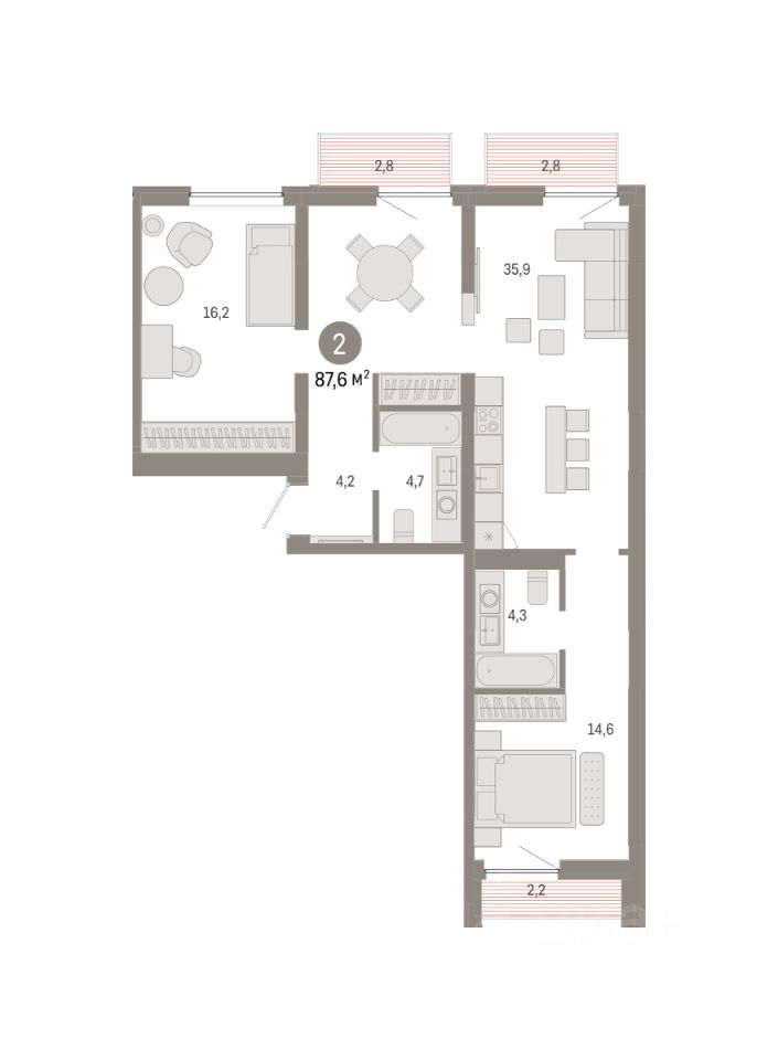 Квартира с кухней-гостиной и двумя спальнями в Южных кварталах. Особенности планировки: окна на две стороны, вид во двор, лоджия, разнесённые спальни, предчистовая отделка, мастер-спальня, балкон.