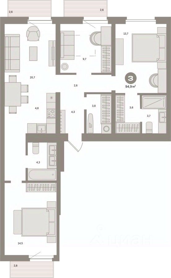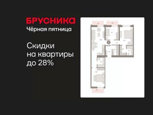 Квартира с кухней-гостиной и тремя спальнями в Южных кварталах. Особенности планировки: окна на две стороны, гардеробная, вид во двор, разнесённые спальни, предчистовая отделка, мастер-спальня, балкон.