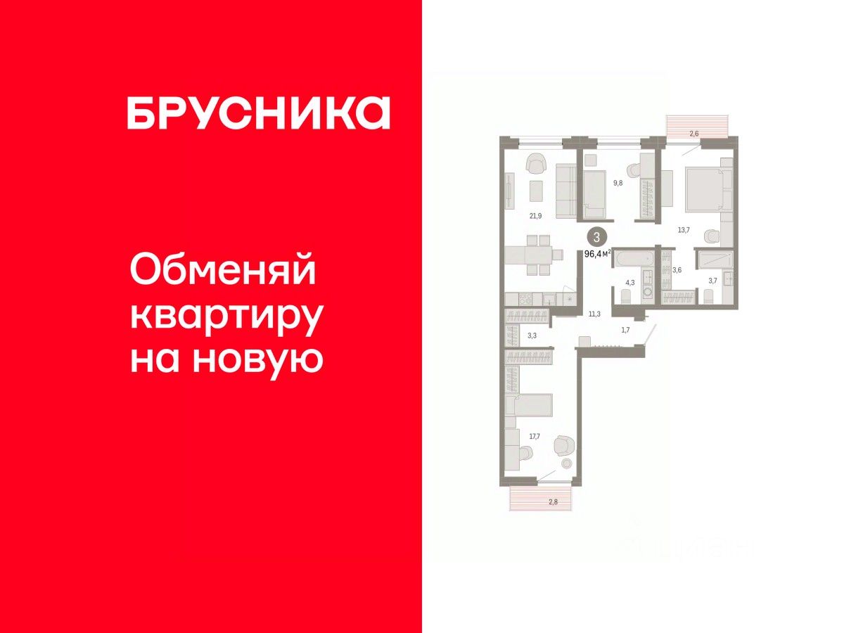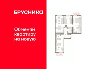 Квартира с кухней-гостиной и тремя спальнями в Южных кварталах. Особенности планировки: балкон, окна на две стороны, предчистовая отделка, разнесённые спальни.