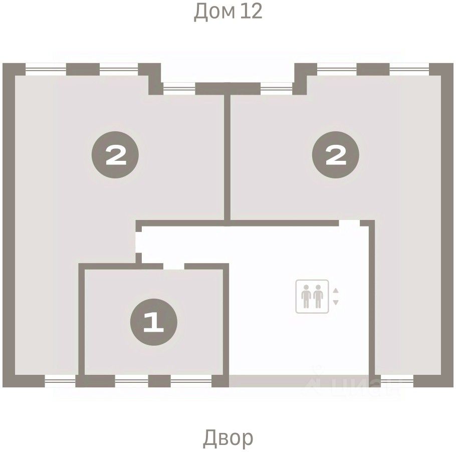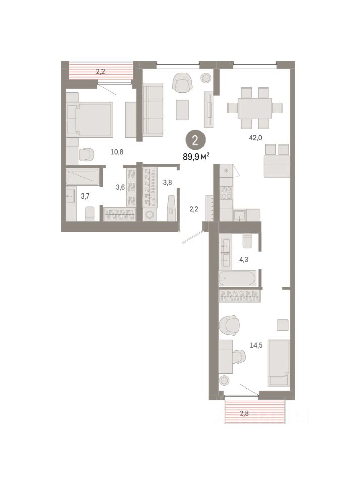 Квартира с кухней-гостиной и двумя спальнями в Южных кварталах. Особенности планировки: окна на две стороны, гардеробная, вид во двор, лоджия, разнесённые спальни, предчистовая отделка, мастер-спальня, постирочная, балкон.