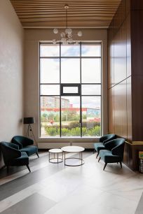 Дизайнерский холл с ресепшн-сервисом, с зонами ожидания, столиками, картинами. На первом этаже 2 лапомойки (с парадного входа и со двора), велоколясочная, гостевой с/у. Так же в доме есть коворкинг, где можно работать или проводить деловые встречи не выходя из башни.