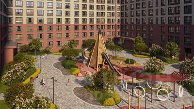 Внутри закрытой территории продуманы детские площадки для ребят разных возрастов. Оборудование на площадке сделано из натуральных материалов.