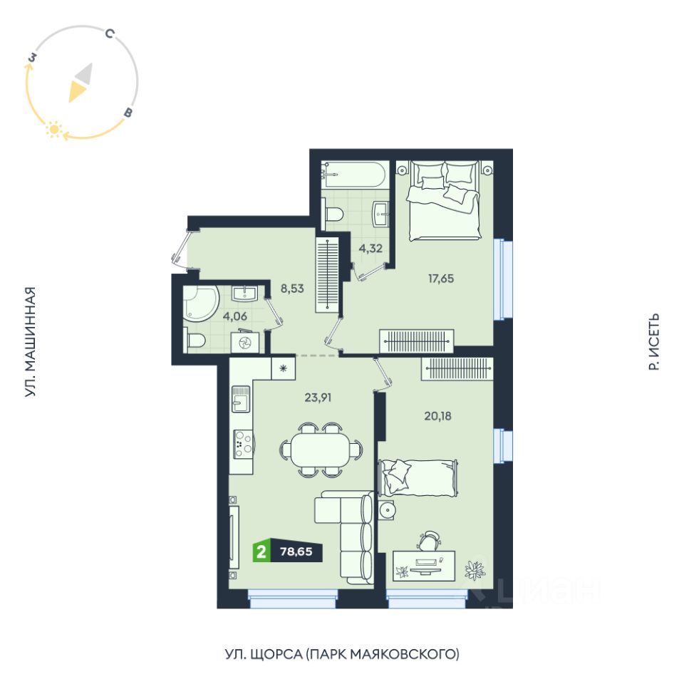 Продаётся 2-комнатная квартира в строящемся доме (Дом 8 (17А-17В)), срок сдачи: IV-кв. 2026, общей площадью 78.65 кв.м., на 3 этаже. В жилом квартале есть собственный выход в ЦПКиО им. Маяковского для утренних пробежек и отдыха всей семьёй.