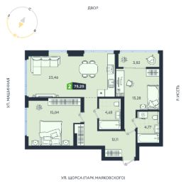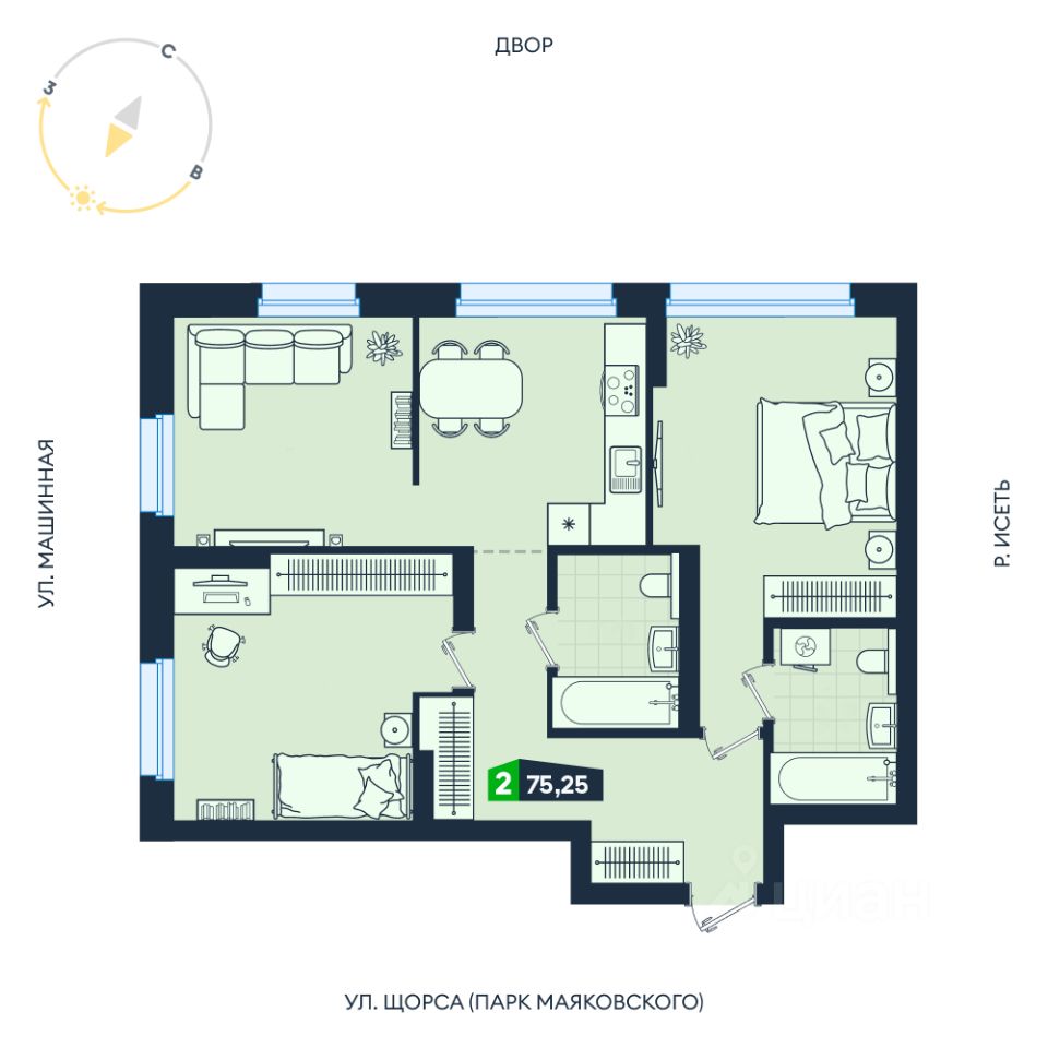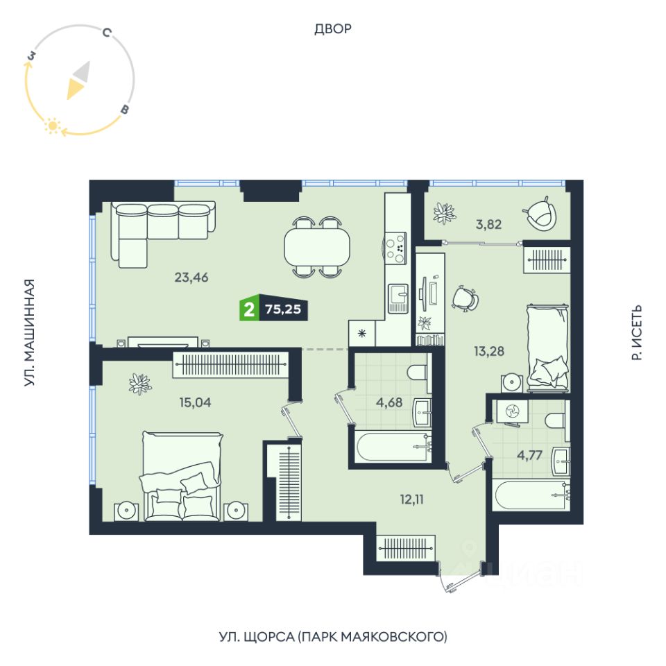 Продаётся 2-комнатная квартира в строящемся доме (Дом 8 (17А-17В)), срок сдачи: III кв. 2027, общей площадью 75.25 кв.м., на 12 этаже. В жилом квартале есть собственный выход в ЦПКиО им. Маяковского для утренних пробежек и отдыха всей семьёй.