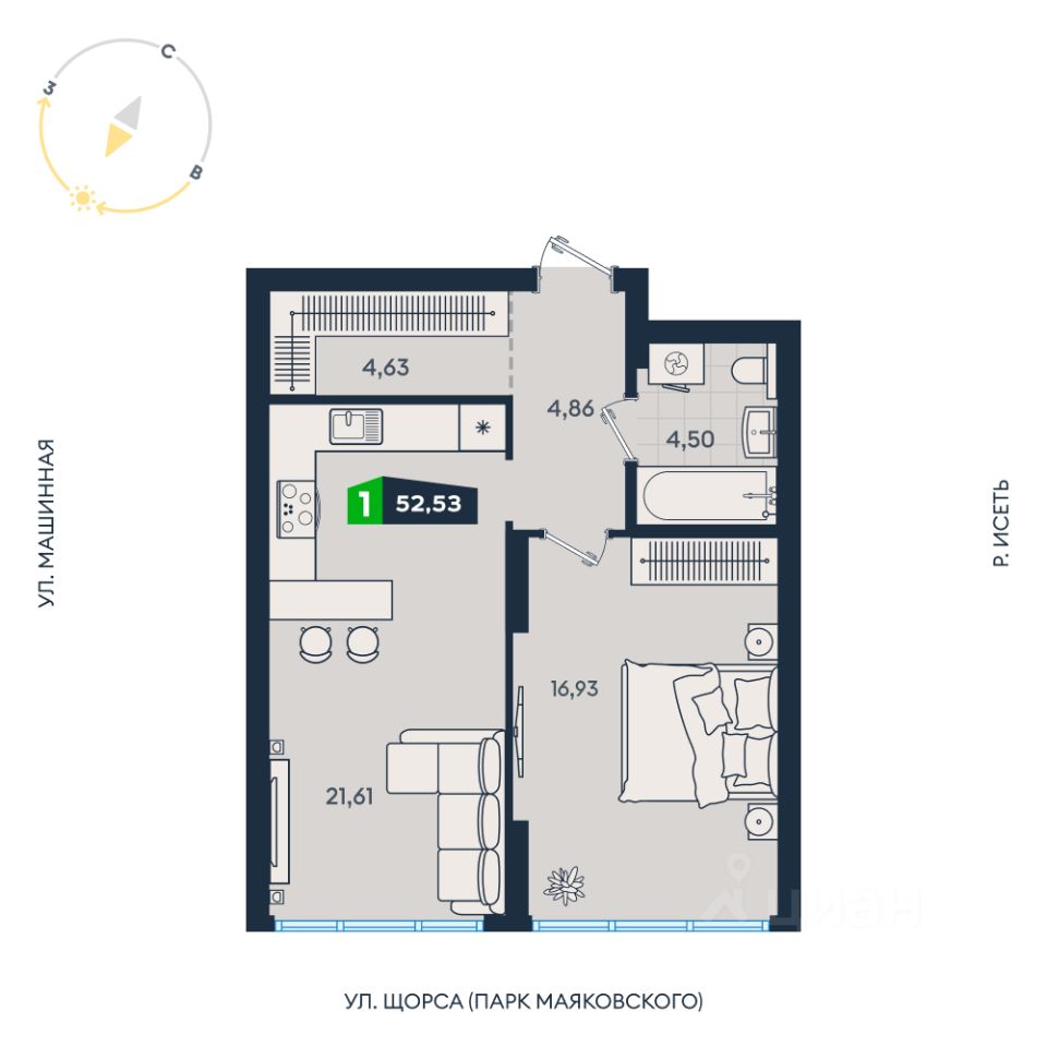 Продаётся 1-комнатная квартира в строящемся доме (Дом 8 (17А-17В)), срок сдачи: IV-кв. 2026, общей площадью 52.53 кв.м., на 2 этаже. В жилом квартале есть собственный выход в ЦПКиО им. Маяковского для утренних пробежек и отдыха всей семьёй.