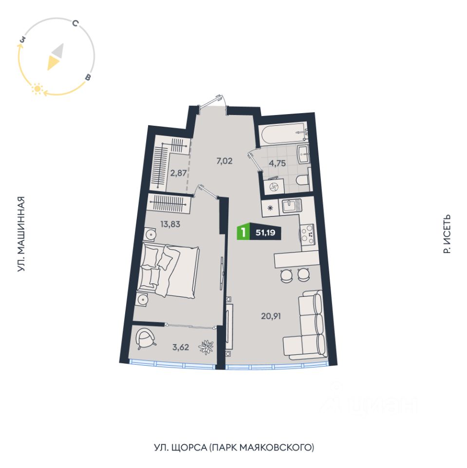 Продаётся 1-комнатная квартира в строящемся доме (Дом 8 (17А-17В)), срок сдачи: IV-кв. 2026, общей площадью 51.19 кв.м., на 12 этаже. В жилом квартале есть собственный выход в ЦПКиО им. Маяковского для утренних пробежек и отдыха всей семьёй.