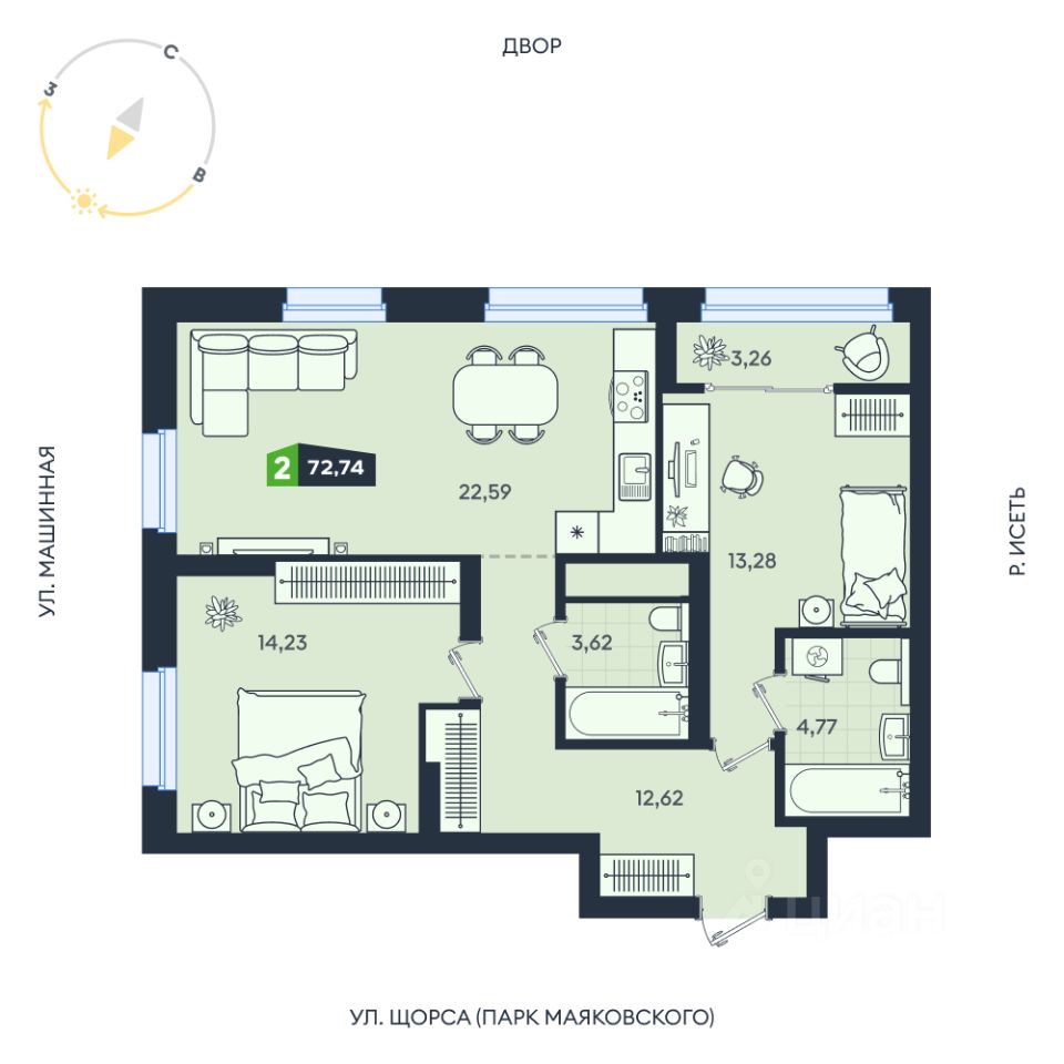 Продаётся 2-комнатная квартира в строящемся доме (Дом 8 (17А-17В)), срок сдачи: IV-кв. 2026, общей площадью 72.74 кв.м., на 28 этаже. В жилом квартале есть собственный выход в ЦПКиО им. Маяковского для утренних пробежек и отдыха всей семьёй.