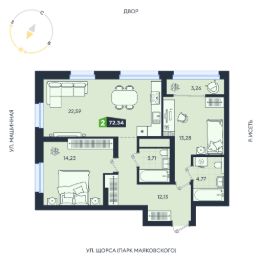 Продаётся 2-комнатная квартира в строящемся доме (Дом 8 (17А-17В)), срок сдачи: IV-кв. 2026, общей площадью 72.34 кв.м., на 18 этаже. В жилом квартале есть собственный выход в ЦПКиО им. Маяковского для утренних пробежек и отдыха всей семьёй.