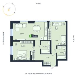 Продаётся 2-комнатная квартира в строящемся доме (Дом 8 (17А-17В)), срок сдачи: IV-кв. 2026, общей площадью 78.46 кв.м., на 2 этаже. В жилом квартале есть собственный выход в ЦПКиО им. Маяковского для утренних пробежек и отдыха всей семьёй.