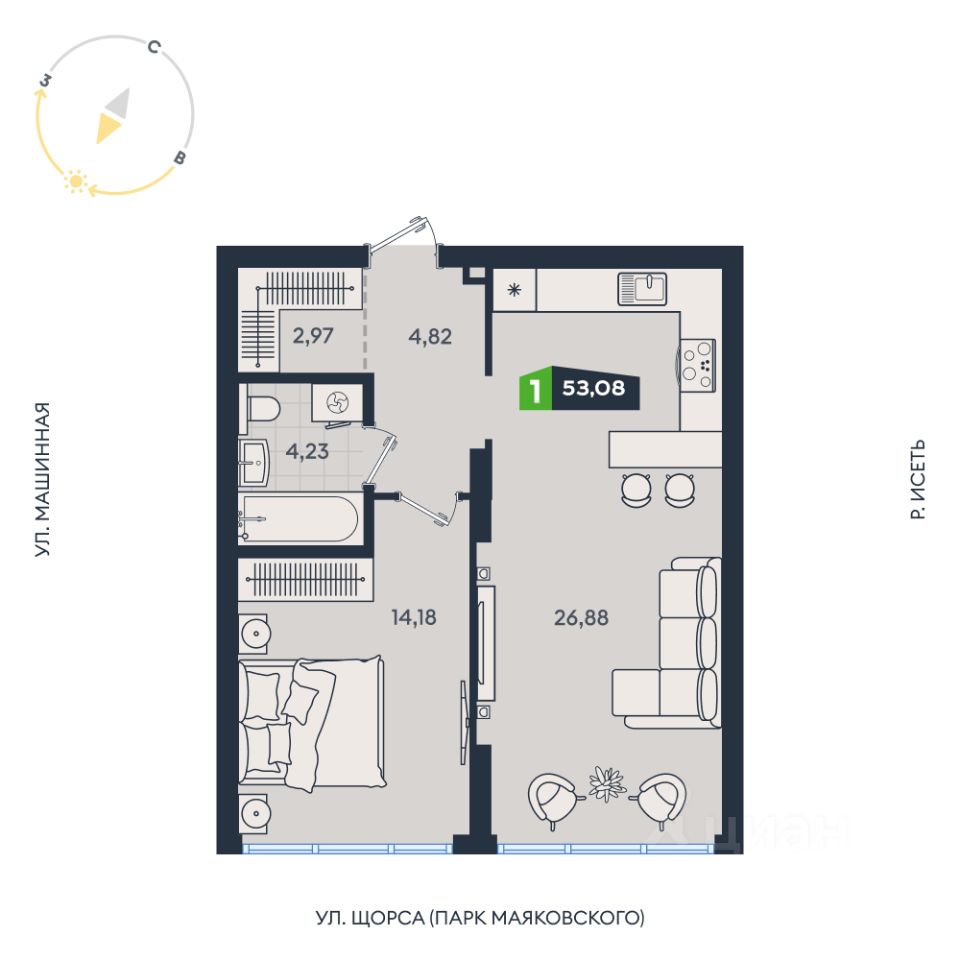 Продаётся 1-комнатная квартира в строящемся доме (Дом 8 (17А-17В)), срок сдачи: IV-кв. 2026, общей площадью 53.08 кв.м., на 2 этаже. В жилом квартале есть собственный выход в ЦПКиО им. Маяковского для утренних пробежек и отдыха всей семьёй.