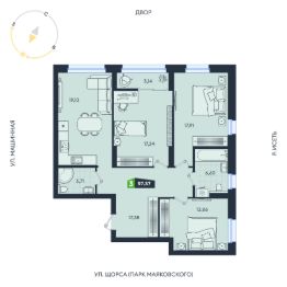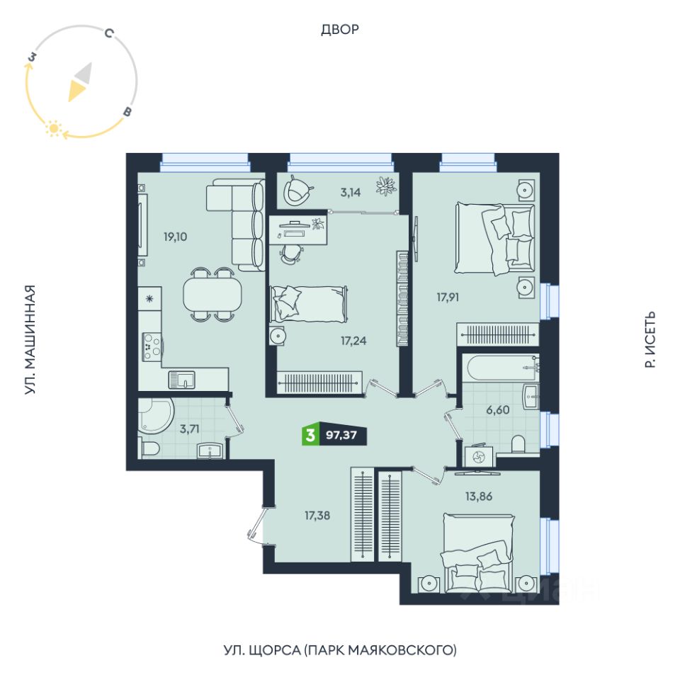 Продаётся 3-комнатная квартира в строящемся доме (Дом 8 (17А-17В)), срок сдачи: III кв. 2027, общей площадью 97.37 кв.м., на 27 этаже. В жилом квартале есть собственный выход в ЦПКиО им. Маяковского для утренних пробежек и отдыха всей семьёй.
