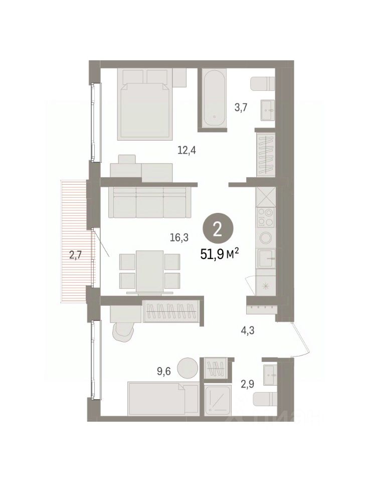 Просторная двухкомнатная квартира с предчистовой отделкой в ЖК "Квартал Траектория" на 3 этаже. Общая площадь: 51.9 кв.м. Высота потолков 2.82 м.
