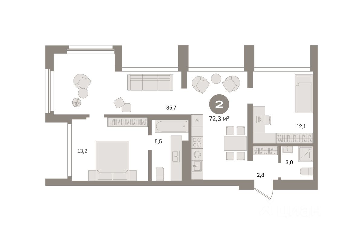 Квартира с кухней-гостиной и двумя спальнями в Южных кварталах. Особенности планировки: предчистовая отделка, мастер-спальня.