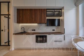 Эргономичная планировка - продуманное хранение, просторный сан.узел, большой кухонный гарнитур, удобный двухспальный диван. Все корпусная мебель выполнена на заказ.