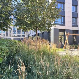 Шикарный двухуровневый озелененный двор с зонами для отдыха взрослых и детей.
