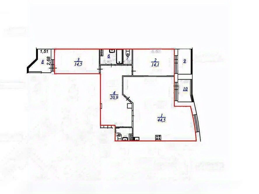 Элегантная эргономика пространства - квартира площадью 103,1 м включает просторную кухню-гостиную 44,7 м, две изолированных спальни по 14,3 м каждая, два раздельных санузла, вместительную прихожую с возможностью организации встроенного гардероба, три светлые лоджии с великолепным видом.