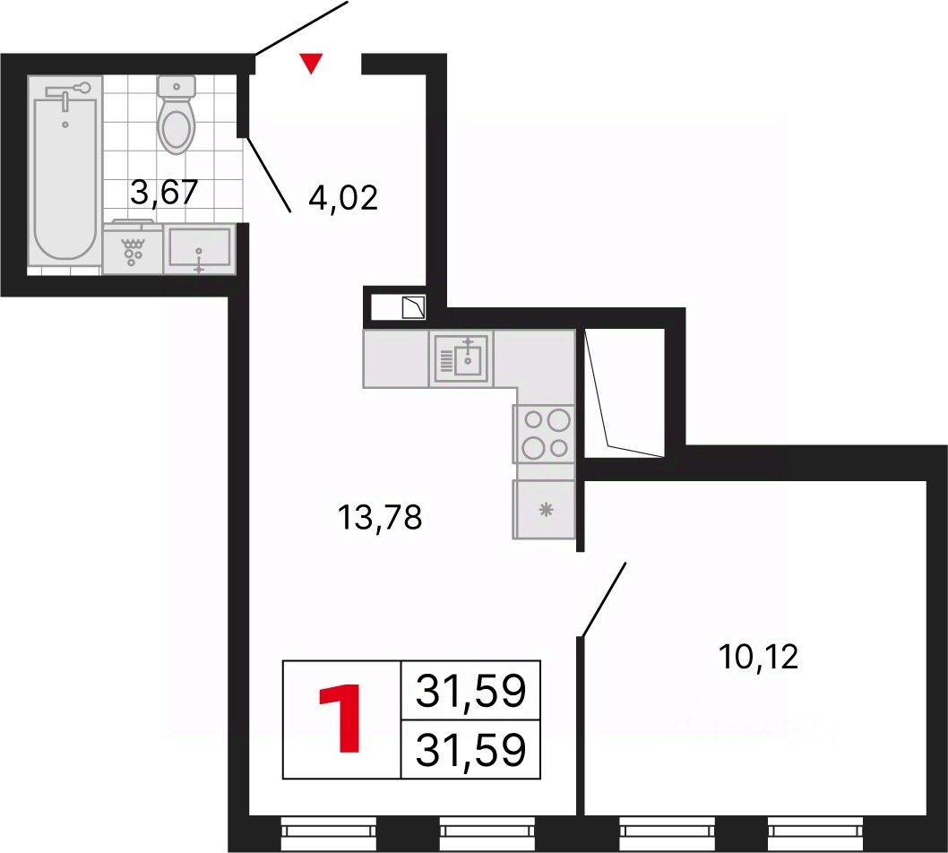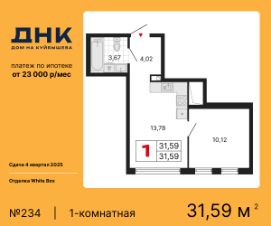 Однокомнатная квартира с предчистовой отделкой в ЖК "ДНК. Дом на Куйбышева" на 22 этаже. Общая площадь: 31.59 кв.м., жилая: 10.12 кв.м., площадь просторной кухни-столовой: 13.78 кв.м. Все окна выходят на одну сторону. В квартире один совмещенный санузел. Высота потолков 2.7 м.