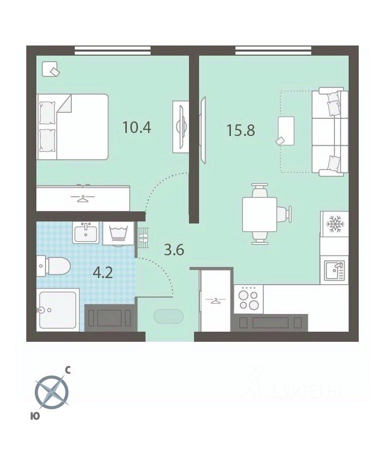 Жилая площадь 10.4 м2, кухня 15.8 м2, чистовая отделка. Раздельных санузлов - нет, балконов - нет, лоджий - нет.