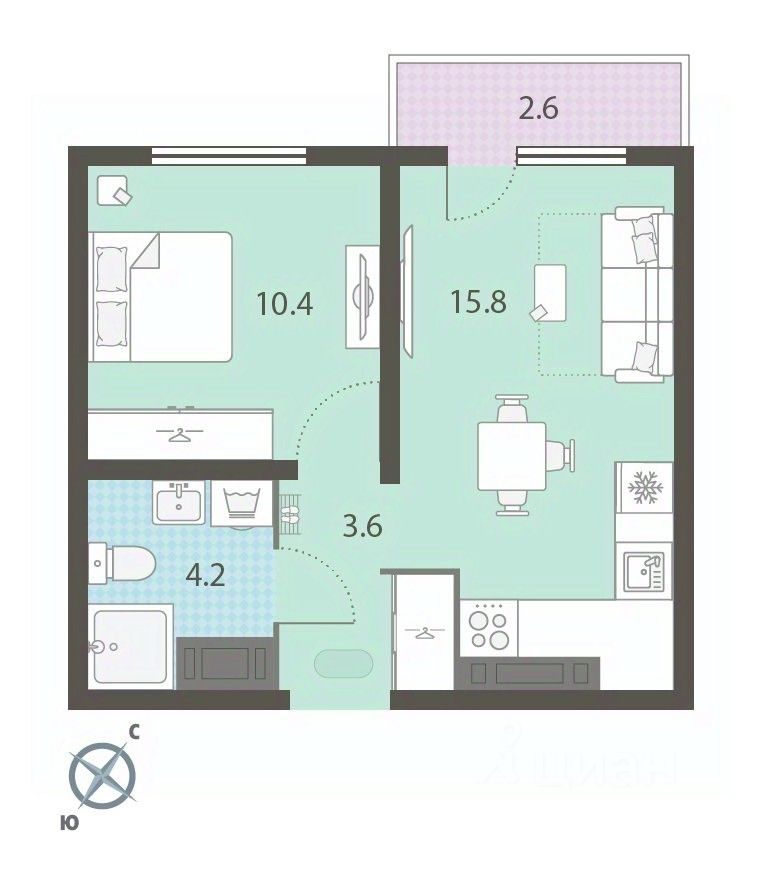 Жилая площадь 10.4 м2, кухня 15.8 м2, чистовая отделка. Раздельных санузлов - нет, балконов - нет, лоджий - нет.