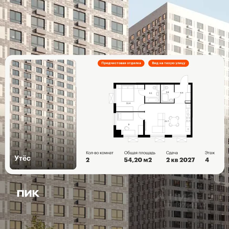 Продаётся 2-комн. квартира площадью 54,2 кв.м на 4 этаже 29 этажного дома (Корпус 6, Секция 1) проекта ПИК Утёс. Светлый просторный подъезд на уровне земли, функциональная планировка, большие окна, предчистовая отделка.