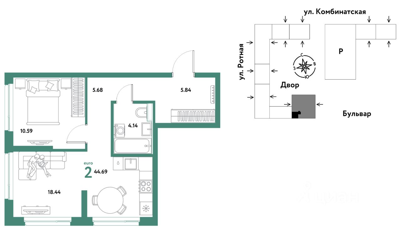 2комнатная квартира площадью 44,69кв. м. на 9 этаже жилого комплекса "Уральский сад".
