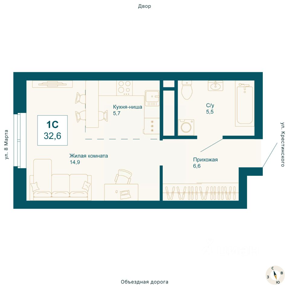 Общая площадь32,6 м²