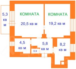 Общая площадь квартиры 59,2 кв.м, жилая 39,7 кв.м., кухня 8,2 кв.м., балкон 5,3 с выходом из гостиной 20,5 кв.м., санузел раздельный 5,4 кв м, прихожая 5,8 кв.м., высота потолков 2,85 м.