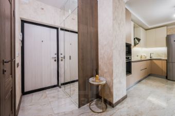 Кухня-гостиная площадью 22,8 м2 позволяет выделить полноценную вторую комнату для размещения большого дивана и широкоформатного телевизора, а также кухонную зону. В кухонной зоне установлен премиальный кухонный гарнитур со встроенной бытовой техникой( в т.ч.посудомоечной машиной): bosch, indesit, samsung и выполнен тёплый пол.