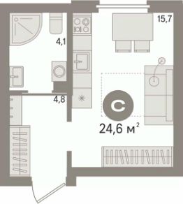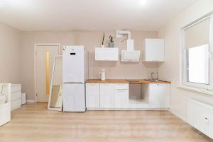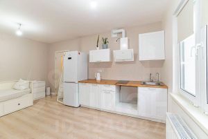 В стоимость квартиры входит: Кухня - кухонный гарнитур с раковиной, смесители, варочная поверхность, вытяжка, холодильник, стол, 2 стула. Ванная комната - душевая кабина, раковина со смесителем, зеркало, стиральная машина, этажерка, унитаз. Коридор шкаф.