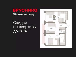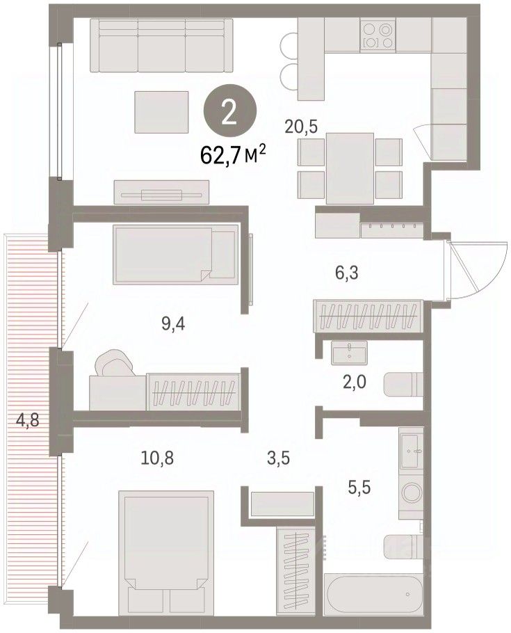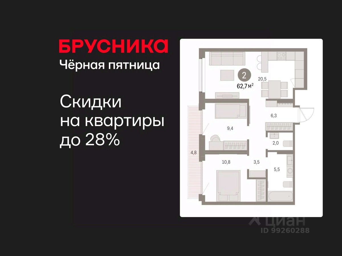 Квартира с кухней-гостиной и двумя спальнями в Бруснике в Академическом. Особенности планировки: второй санузел, предчистовая отделка, балкон.