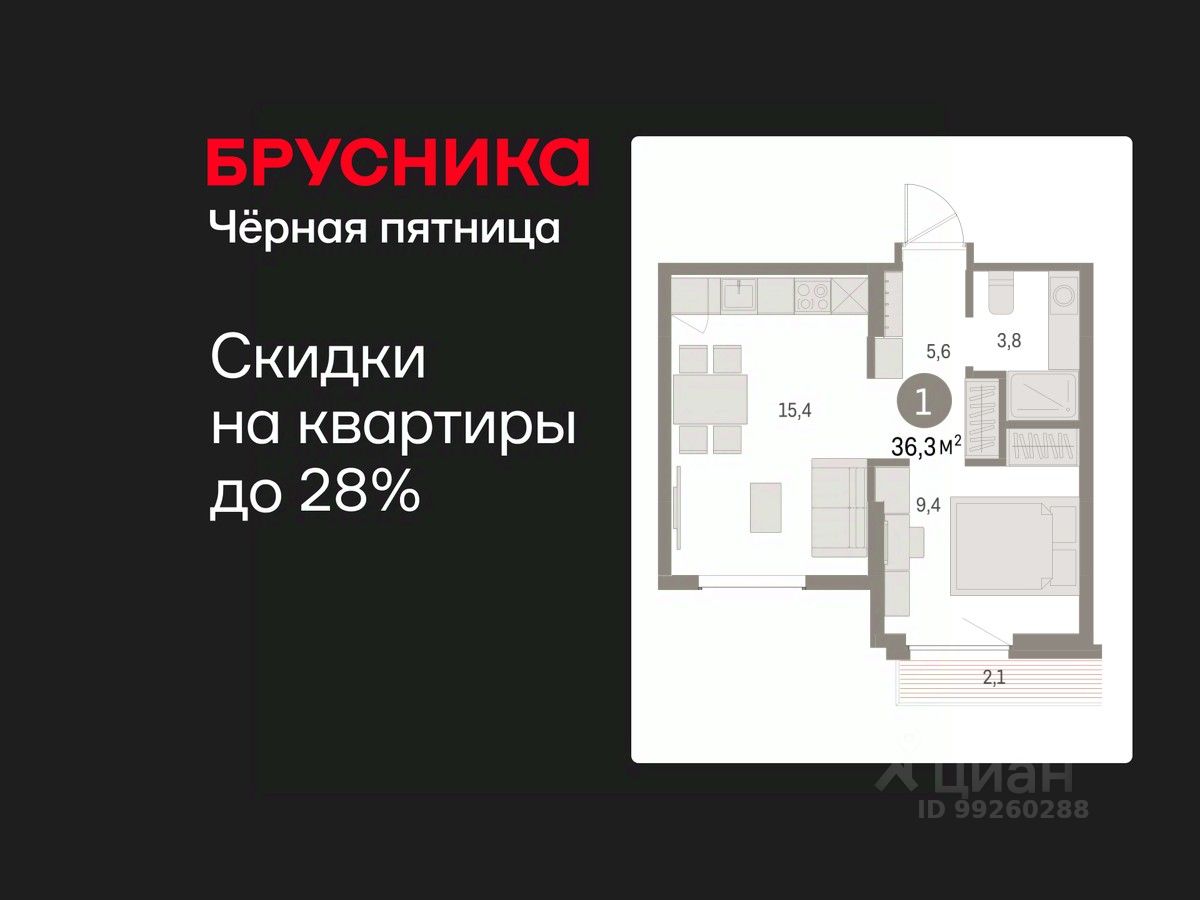 Квартира с кухней-гостиной и одной спальней в Бруснике в Академическом. Особенности планировки: предчистовая отделка, балкон.