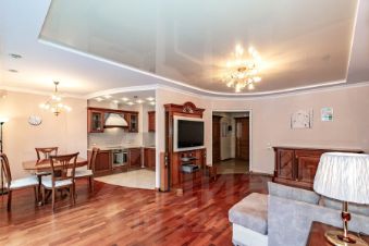 Дизайн квартиры в классическом стиле добротного исполнения, так как вся мебель, двери и наличники из массива дерева в одной цветовой гамме.