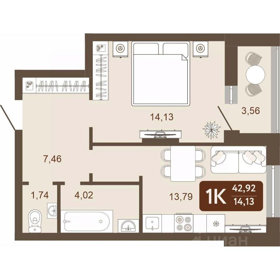 Общая площадь42,92 м²