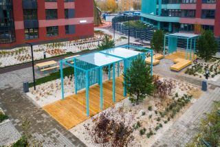 На первых этажах жилых домов разместятся магазины, кафе, ресторан, кондитерская, фитнес-центр, встроенный детский садик. Для удобства автовладельцев будет построен многоуровневый наземный паркинг.