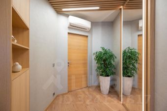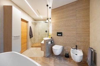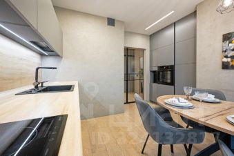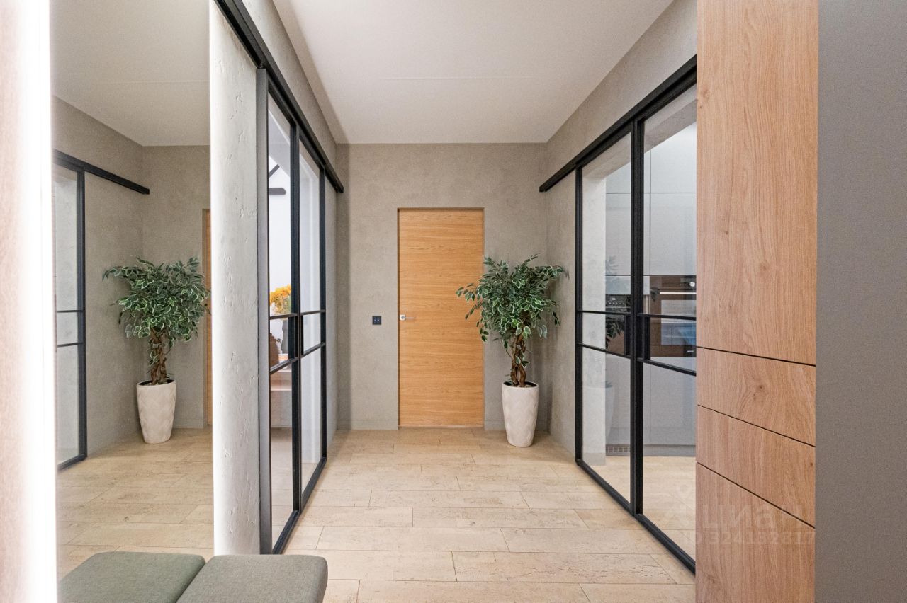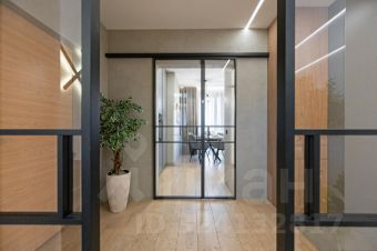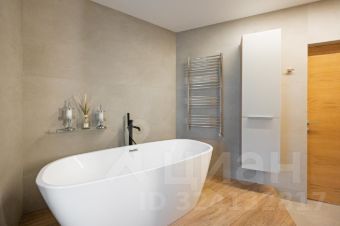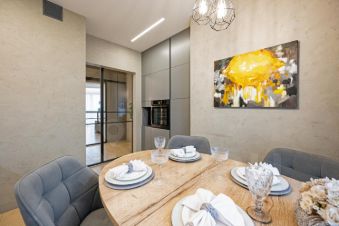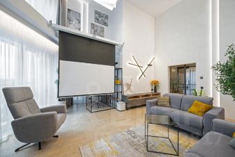 В гостиной размещён экран для семейных киносеансов, а по всей квартире установлены автоматические карнизы. При включении сценария "просмотр кино" портьеры закрываются, свет автоматически гаснет, остаётся только дежурный торшер, опускается экран. Несколько сценариев реализовано и в спальне. Встроенный плинтус с подсветкой отвечает за ночное освещение и работает по датчику присутствия, поэтому ребёнок или взрослый никогда не окажутся в тёмном коридоре. Свет также подчёркивает фактуру материалов. Сплит система позволяет регулировать комфортную температуру дома круглогодично. Установлена премиальная техника: стиральная машина с сушкой Neff,варочная поверхность, микроволновая печь, отчистка воздуха, вытяжка, посудомоечная машина Gorenje. Вся сантехника с термостатом.