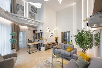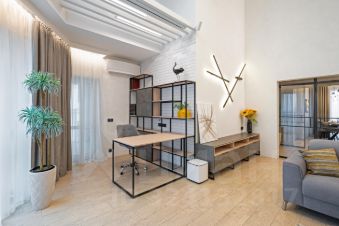 Уникальность объекта состоит в его архитектурных особенностях: квартира расположена на последнем этаже, благодаря чему в гостиной есть второй свет с высотой стен 6 метров. Это позволило установить настоящий камин с живым огнём.