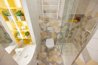 В интерьере много серых оттенков, но везде покрытие разное, поэтому создаётся обволакивающее, расслабляющее настроение. В качестве акцентного цвета в гостиной используется жёлтый, он делает интерьер свежим. А пробковое покрытие на полу способствует акустическому комфорту.